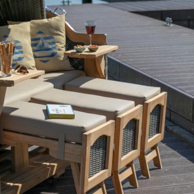 Der deVries Pure Seemöwe XL PE stone grey besitzt bei der Ausstattung an Kissen und Bezüge sowie beim Komfort alle Vorzüge wie sein “Bruder”. Als Holz wird hier allerdings Teak aus Indonesien verwendet. Dieses Naturprodukt lässt sich sehr gut verarbeiten. Dank seiner natürlichen Öle bleibt sehr lange schön und ist zudem absolut witterungsbeständig. Da die verwendeten Hölzer oft von unterschiedlicher Herkunft sind, gibt es interessante Farbunterschiede. Im Laufe der Zeit gleichen sie sich aber immer mehr an. Zudem entwickelt Teakholz eine silbergraue Patina – ein natürlicher Prozess, der das exklusive Gartenmöbel mit den beiden Bullaugen noch besonderer Macht.